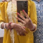 It is a gold bangle , color gold and has design all over the bangle. In the attached photo, you can see the bangle on my right hand ( the hand which bis holding the mobile phone).