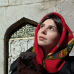 It’s a red square head scarf with brightly colored patterns: yellow, green, and blue. It’s wool and has frayed edges.