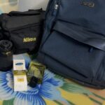 Items that have in the luggage is a purple bag along with Nikon DSLR camera Model Number is D-3500 with some food items, perfume of Zara.