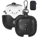 Apple AirPods inside black leather keychain case with button in the front.