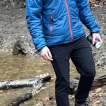 It is a bright blue colour with a mountain logo on, it has an orange fleecy inside and a set of car keys in the pocket. The car key is red and the rest of the keys are silver. There’s a red and silver round keyring on there.