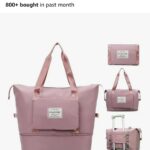Its a light pink color hand bag has about 3 to 4 shoes crocs and one more shoe and few clothes and 2 Vietnamese dolls. It has a small zip also in the front.