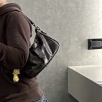 It’s a brown leather handbag with two gold keychains, inside were glasses, a green wallet and a light blue hairbrush.