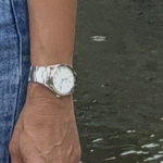 Silver men’s watch, large analogue face. I believe it is a Timex.