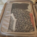It is a rose coloured hard small suitcase (carry-on) luggage. I don’t think there is a tag on it. There are rose gold zippers. There is a bag inside of prescription medication with my name in it. There is a brand new pair of black shoes with tags still on-Bobs. There are 2 brown checkered vacuum sealed bags with many clothing items. There is a pair of Meohisto sandals, a flat curling iron