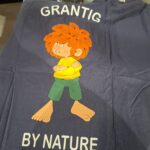 The animated character was printed on the back side ,writing: GRANTIG BY NATURE and stitched on the front side but in a smaller size the character.