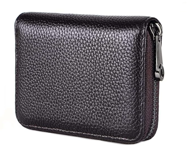 A card size black wallet with black zip it contains my emirates id name of Raj kumar, driving license, debit card, credit card, INR 4000, AED 50. |