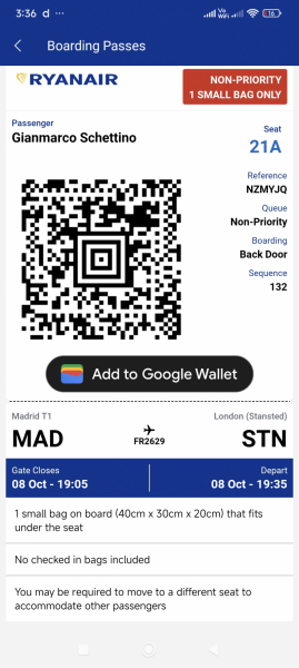 Location Details: | Hello, my name is Gianmarco Schettino. I travelled with Ryanair on flight FR2629 from Madrid to London Stansted on 8 October 2025.Our flight was delayed by about two hours, and we landed in London around 11:20 pm.I remember using my passport at the gate after landing, but I may have lost it there or on the aircraft.Could you please check if my passport has been found or handed in from that flight |