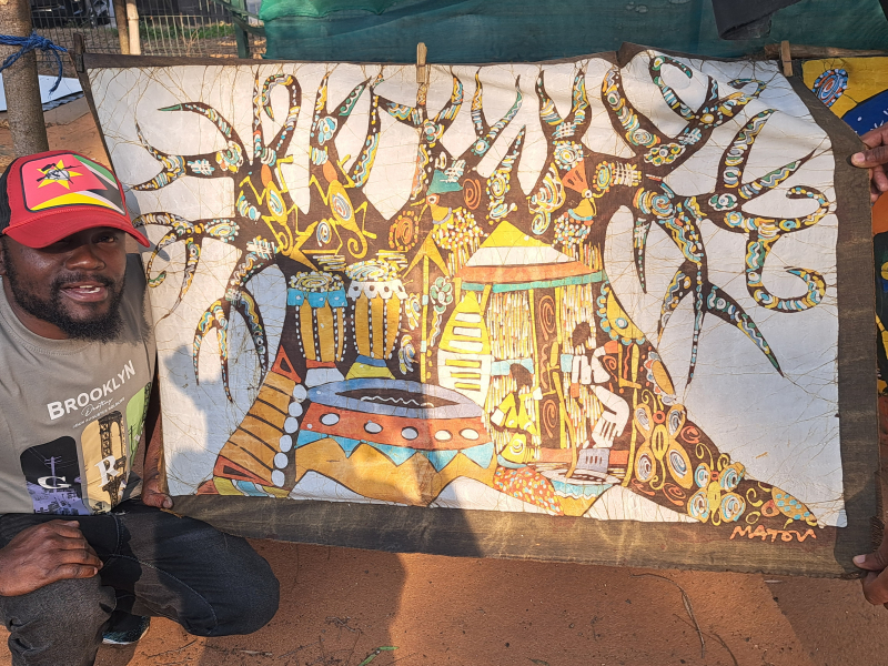 Its big, like 1 meter size, rectangukar, representing a baobab tree, with some human and animal figures, in Black, Brown, orange and blue colors. Its going to be a wedding present, so please I hope you found it |